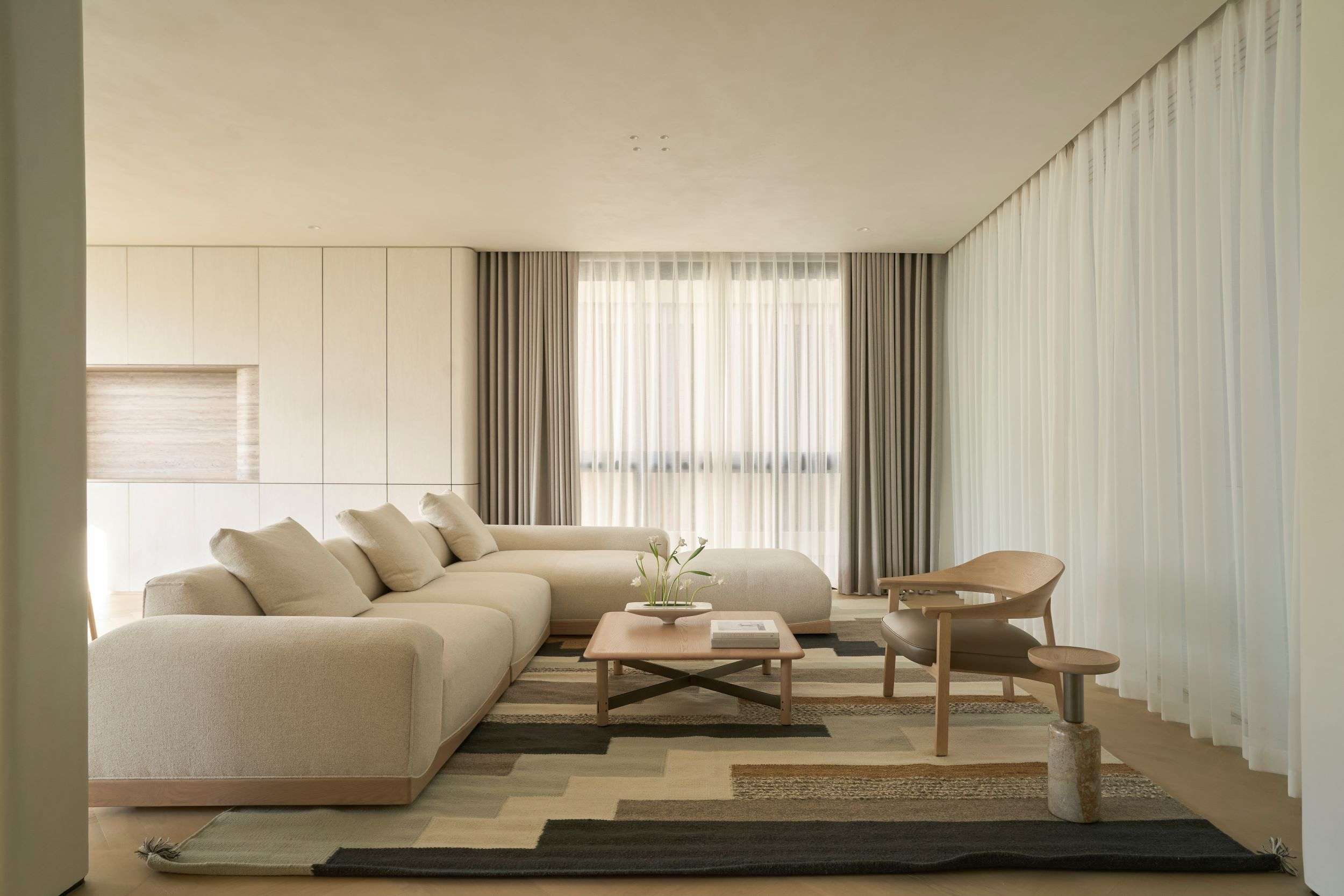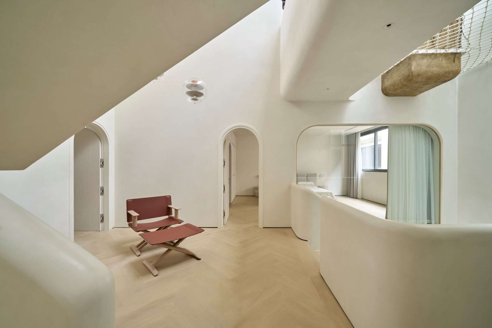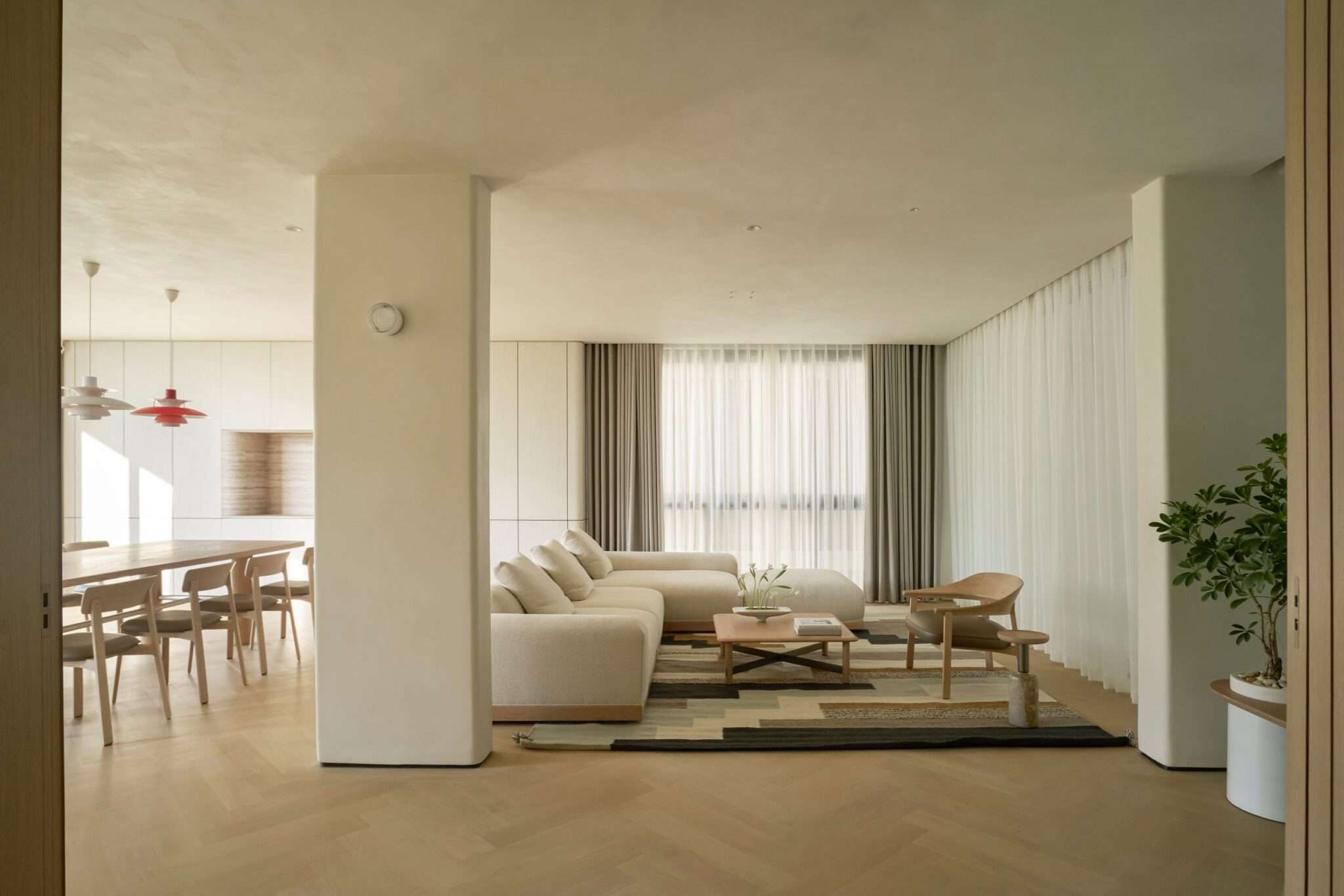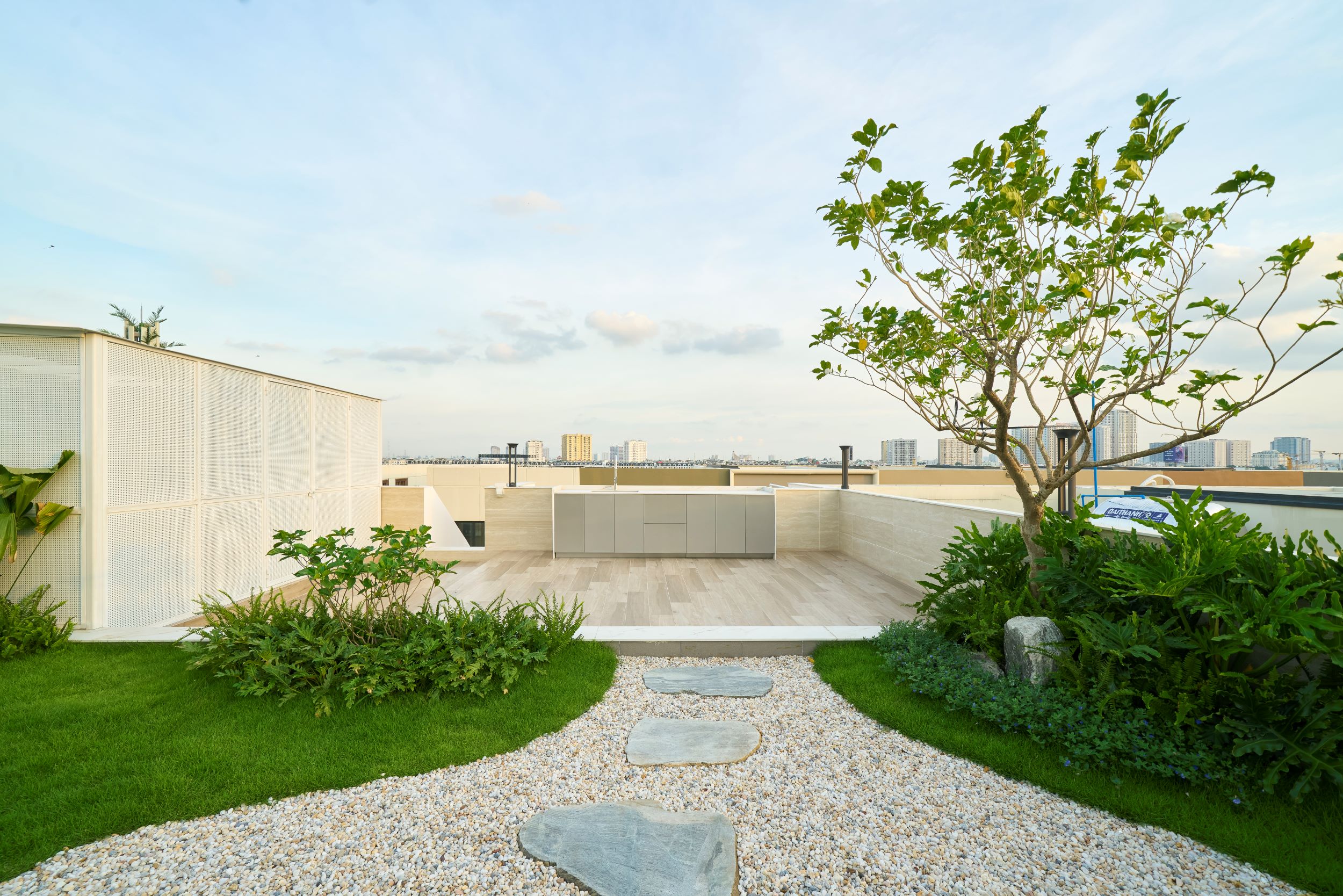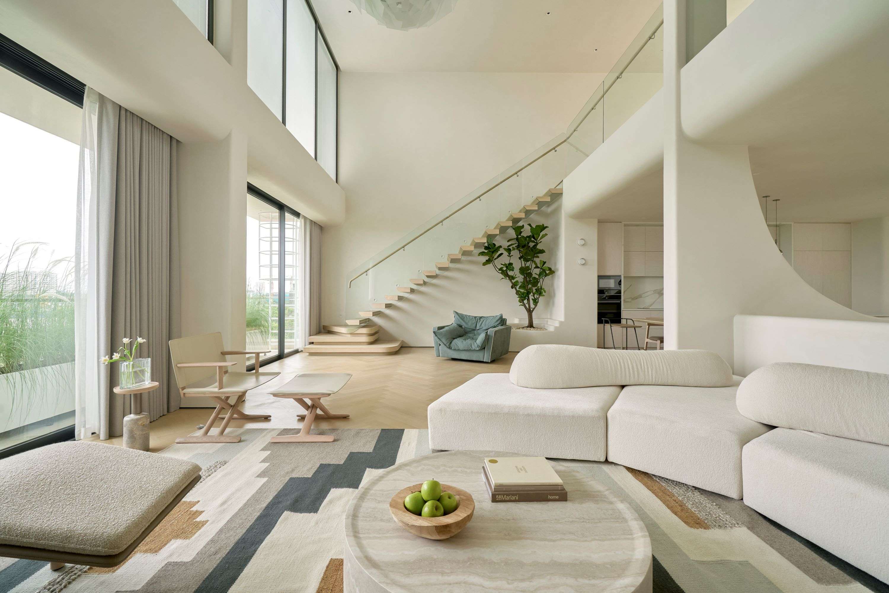 Ngôi nhà này được xây dựng với mục tiêu hàng đầu là đảm bảo an toàn cho trẻ nhỏ, vì thế mọi chi tiết, dù nhỏ nhất, đều được thiết kế có góc bo tròn mềm mại, tạo nên một điểm nhấn thẩm mỹ xuyên suốt toàn bộ thiết kế. Các đường cong của ngôi nhà được xử lý bởi những người thợ thủ công, chuyển tiếp liền mạch từ mặt đất lên đến tầng thượng, điều này không chỉ giúp giảm nhiễu thị giác mà còn tăng được tính “tĩnh” cho tổng thể ngôi nhà. Chúng tôi không cố gắng tạo nên những điểm nhấn độc đáo nhưng xa lạ ở công trình này, thay vào đó, đội ngũ thiết kế tập trung xây dựng các trải nghiệm mới mẻ trong không gian. Các khoảng thông tầng đều gắn với lối giao thông chung để mở thoáng và giải phóng tầm nhìn cho người sử dụng. Tổng thể bố cục được chắt lọc rất tinh giản, dù là thiết kế mở nhưng vẫn có sự ngăn cách giữa các không gian sinh hoạt. Thay vì sử dụng các vách tường ngăn cách, chúng tôi chọn sử dụng hệ cửa lùa Slim khi cần phải ngăn không gian hoặc giảm tiếng ồn.