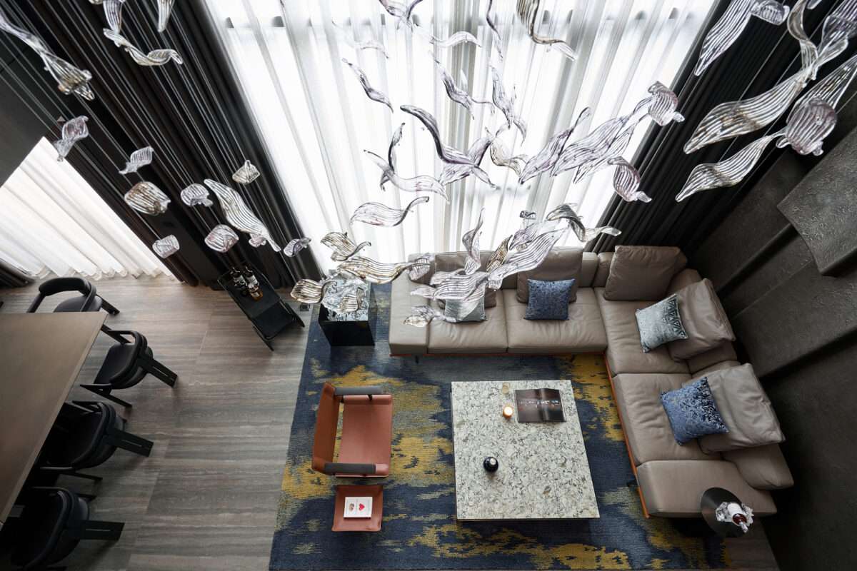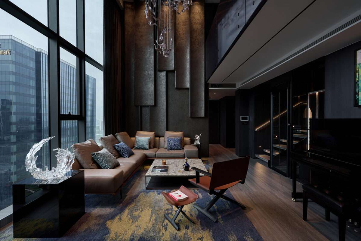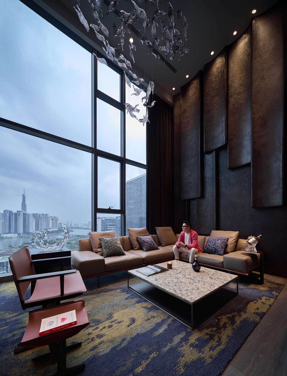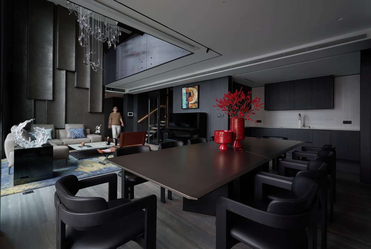 Giữa tầng cao, nơi ánh sáng và không khí giao thoa, căn penthouse này hiện diện như một biểu tượng của sự mạnh mẽ và sáng tạo. Tông màu tối được sử dụng không phải để che giấu, mà để làm nền cho những chi tiết độc bản – từ chiếc đèn chùm như một tác phẩm điêu khắc cho đến phòng rượu như một bức tranh sống động.