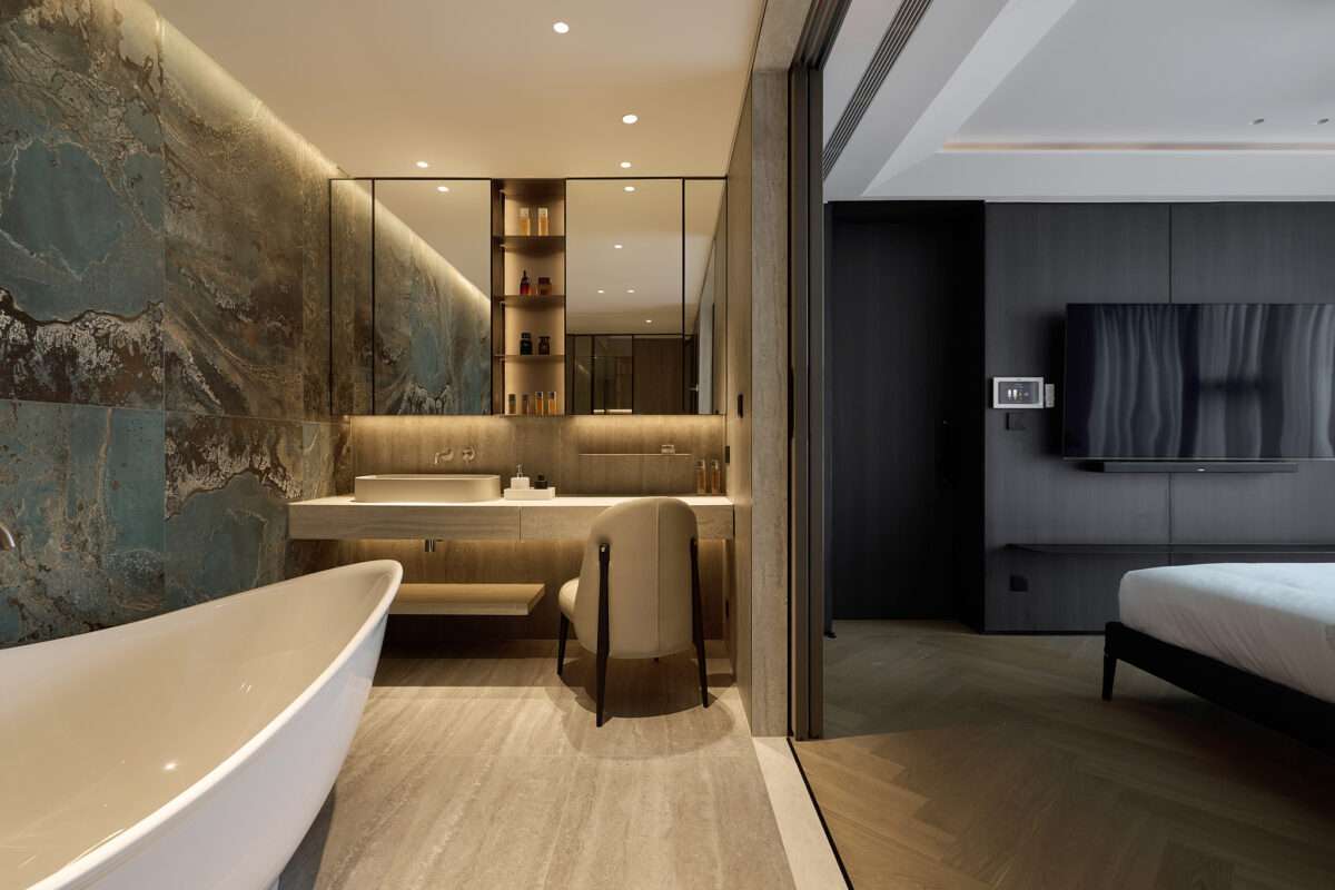 Trong khi không gian sinh hoạt sử dụng màu tối mạnh mẽ là chủ đạo thì phòng ngủ sẽ mang bầu không khí ấm áp hơn. Vách bọc da kết hợp với cửa lùa phòng tắm được xử lí khéo léo tạo nên nét đẹp sang trọng, mềm mại. Bồn tắm được đặt vị trí hợp lí có thể nằm thư giãn, ngắm nhìn thành phố xuyên qua hệ vách kính phòng ngủ mà vẫn giữ được sự riêng tư.