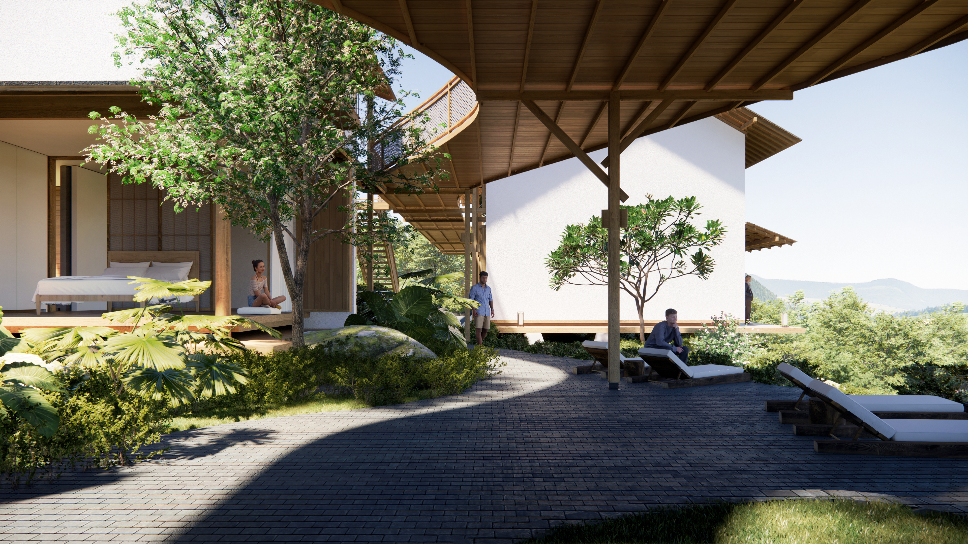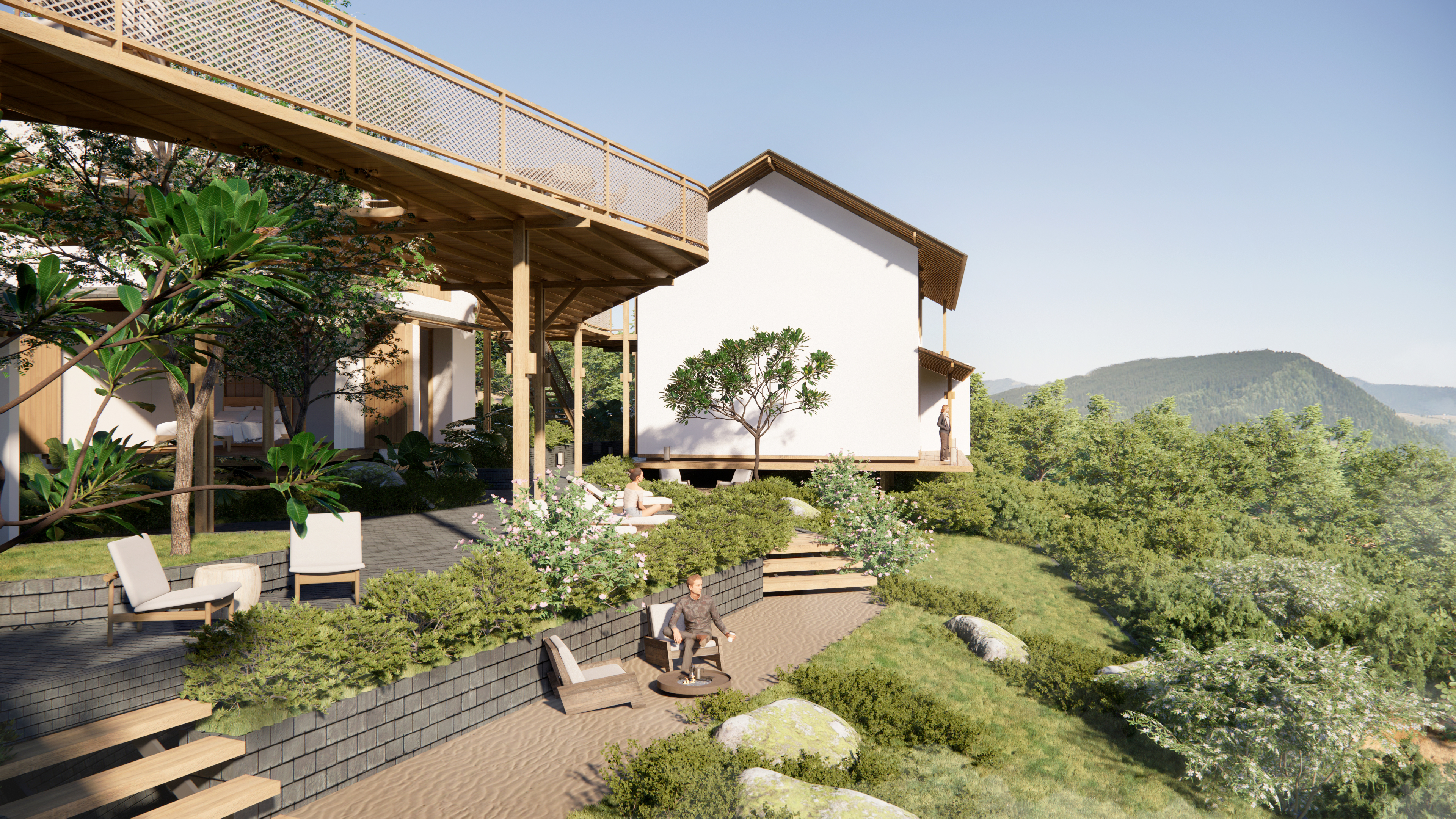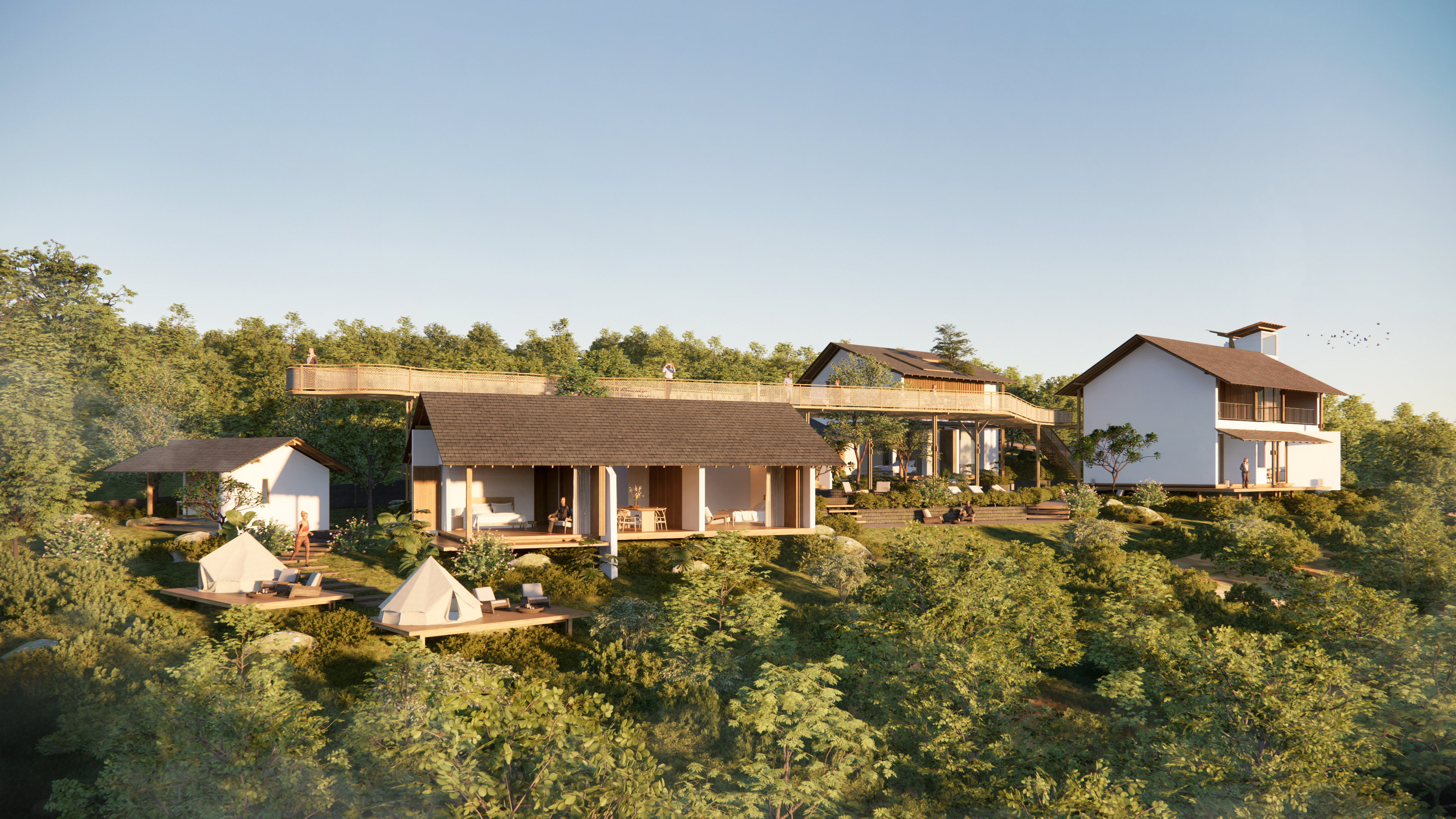 Khu đất được tổ chức thành nhiều khu vực chức năng với tiện ích đa dạng nhưng vẫn giữ sự liên kết chặt chẽ. Một trong những ý đồ sáng tác nổi bật chính là sự xen kẽ giữa kiến trúc và cảnh quan, trong đó có không gian mở ra cả nội khu lẫn thiên nhiên, có phòng hướng trọn ra cảnh rừng và hồ, đồng thời vẫn giữ sự riêng tư nhờ cách xoay hướng nhìn khéo léo để tránh sự đối diện trực tiếp giữa các khối. Nhờ vậy, người lưu trú có thể tùy chọn góc nhìn theo sở thích, từ cảnh rừng xanh mát bên trái cho đến hoàng hôn rực rỡ phía xa.