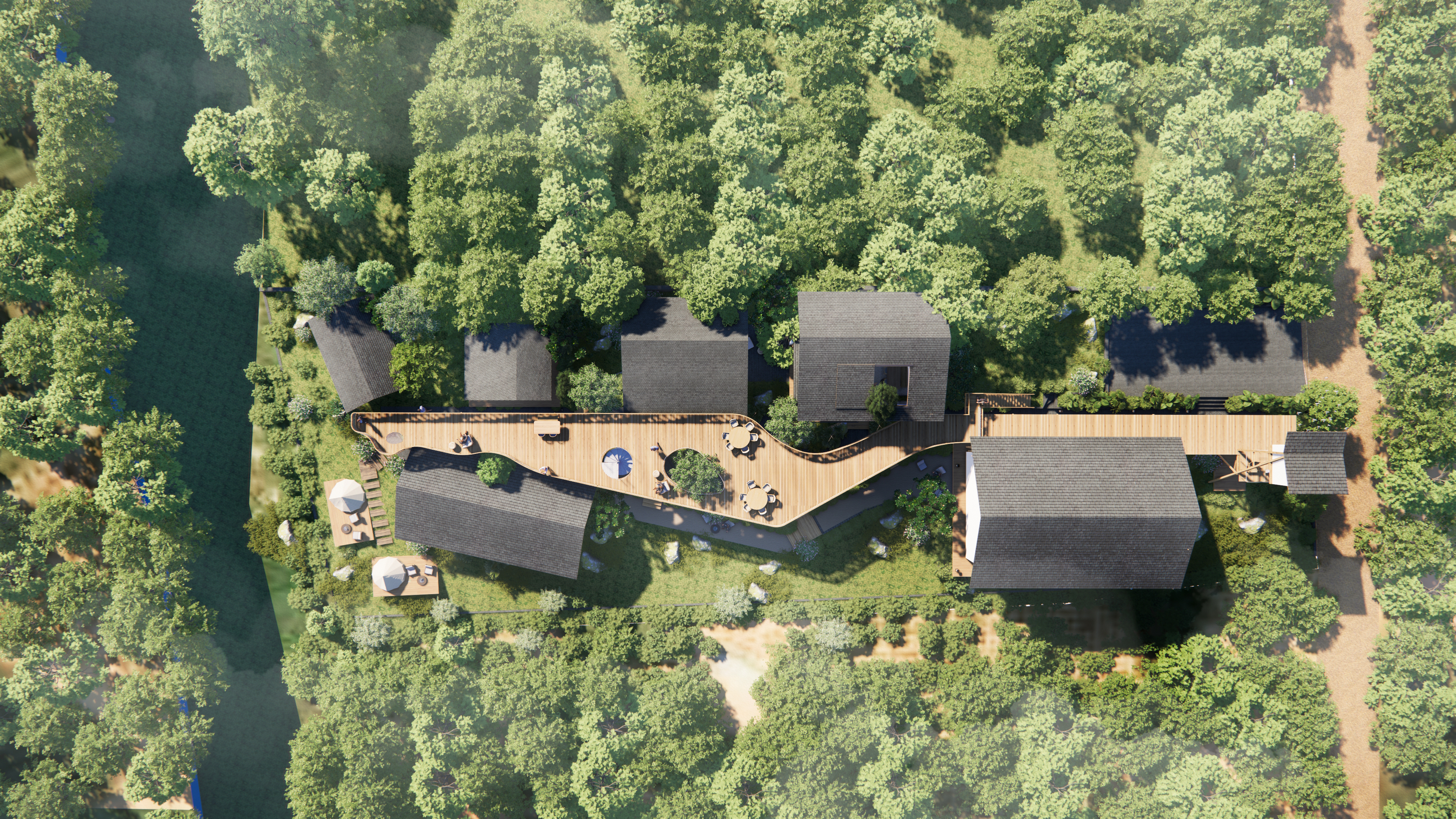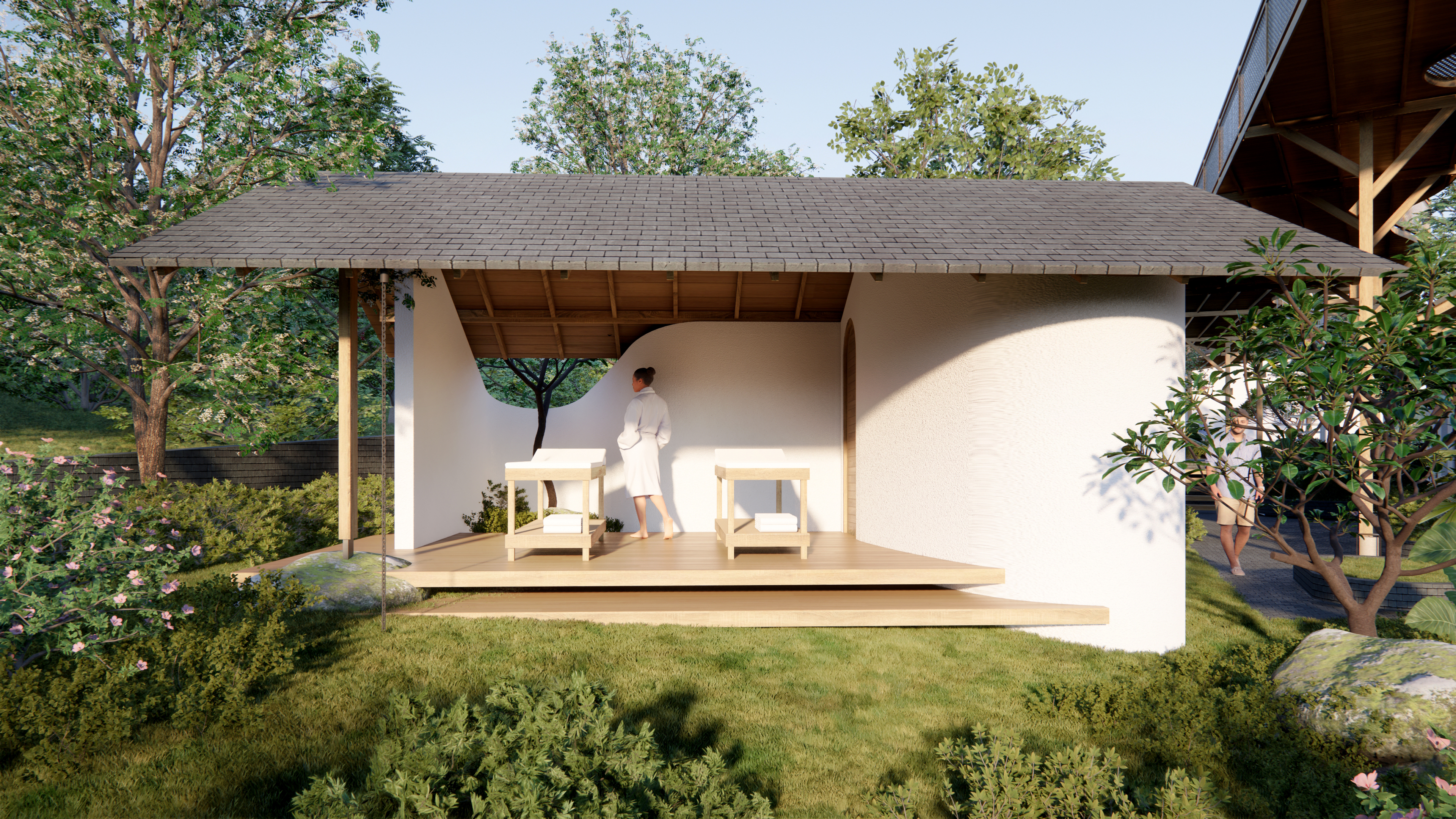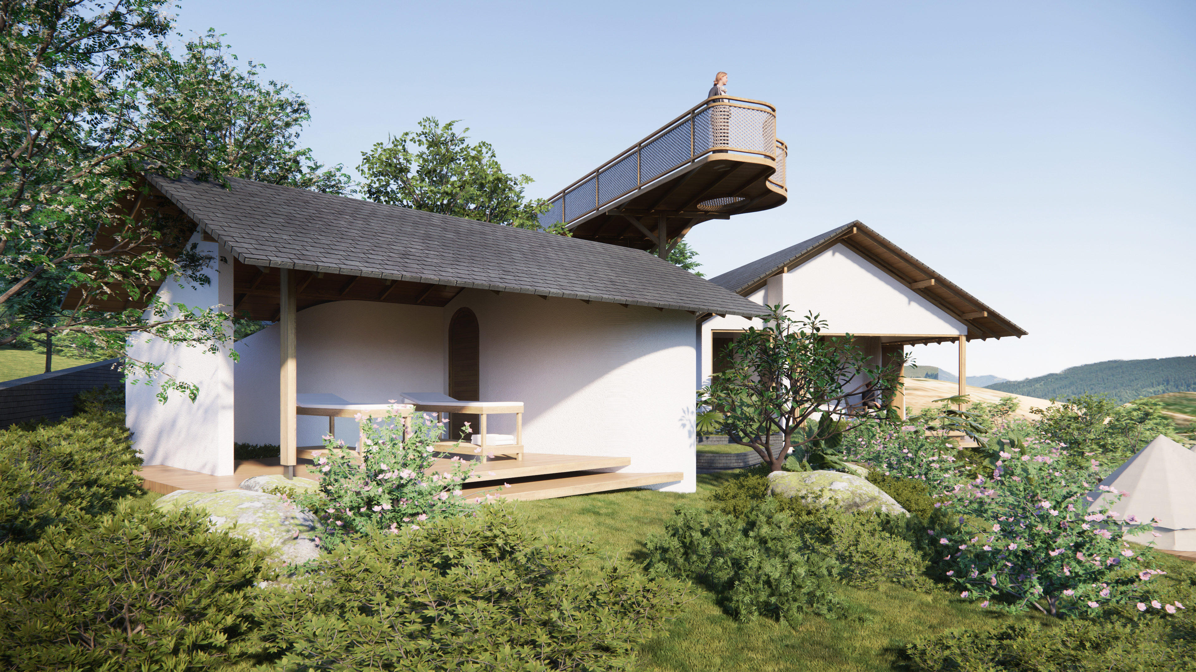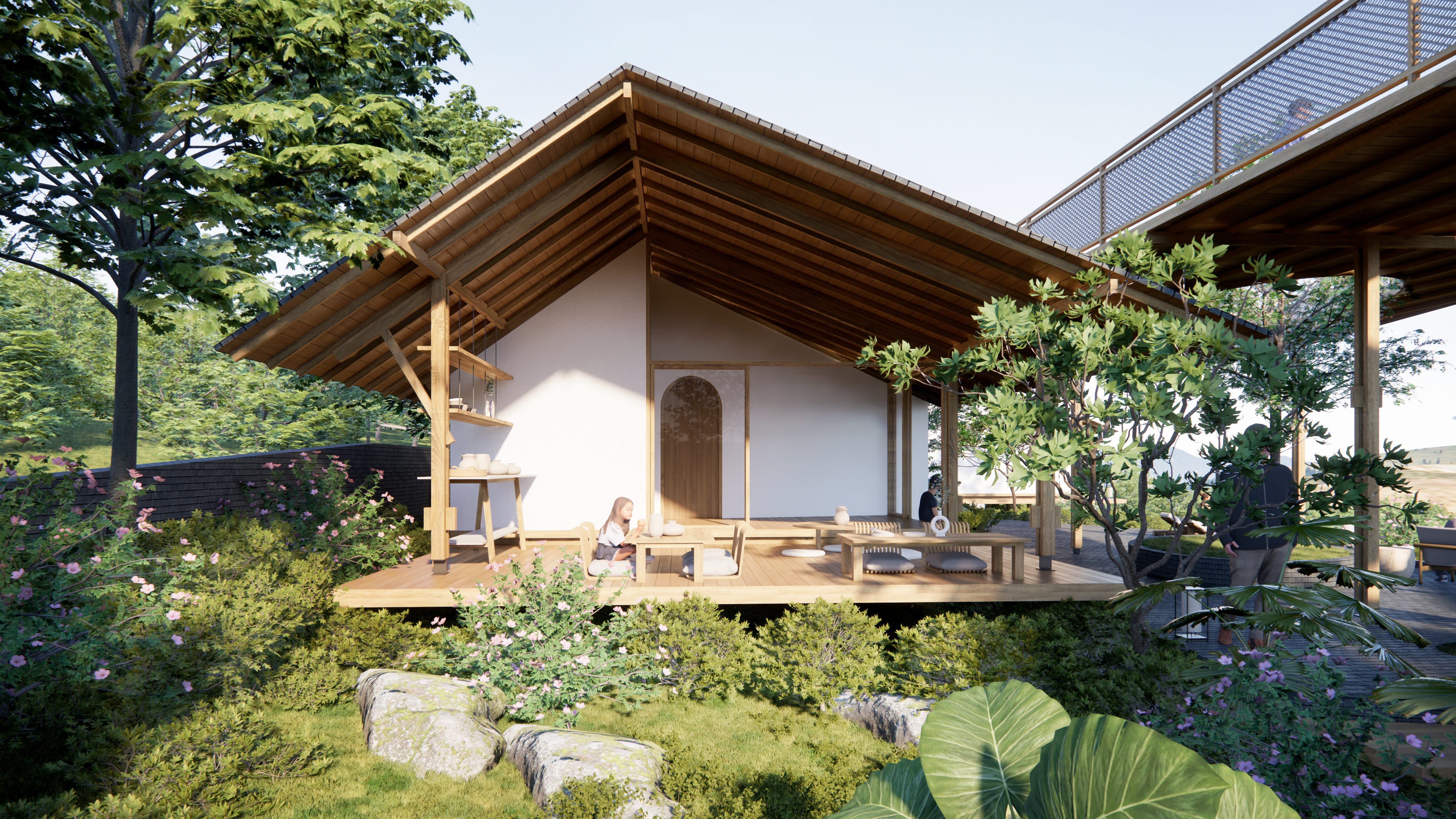 Khu đất được tổ chức thành nhiều khu vực chức năng với tiện ích đa dạng nhưng vẫn giữ sự liên kết chặt chẽ. Một trong những ý đồ sáng tác nổi bật chính là sự xen kẽ giữa kiến trúc và cảnh quan, trong đó có không gian mở ra cả nội khu lẫn thiên nhiên, có phòng hướng trọn ra cảnh rừng và hồ, đồng thời vẫn giữ sự riêng tư nhờ cách xoay hướng nhìn khéo léo để tránh sự đối diện trực tiếp giữa các khối. Nhờ vậy, người lưu trú có thể tùy chọn góc nhìn theo sở thích, từ cảnh rừng xanh mát bên trái cho đến hoàng hôn rực rỡ phía xa.