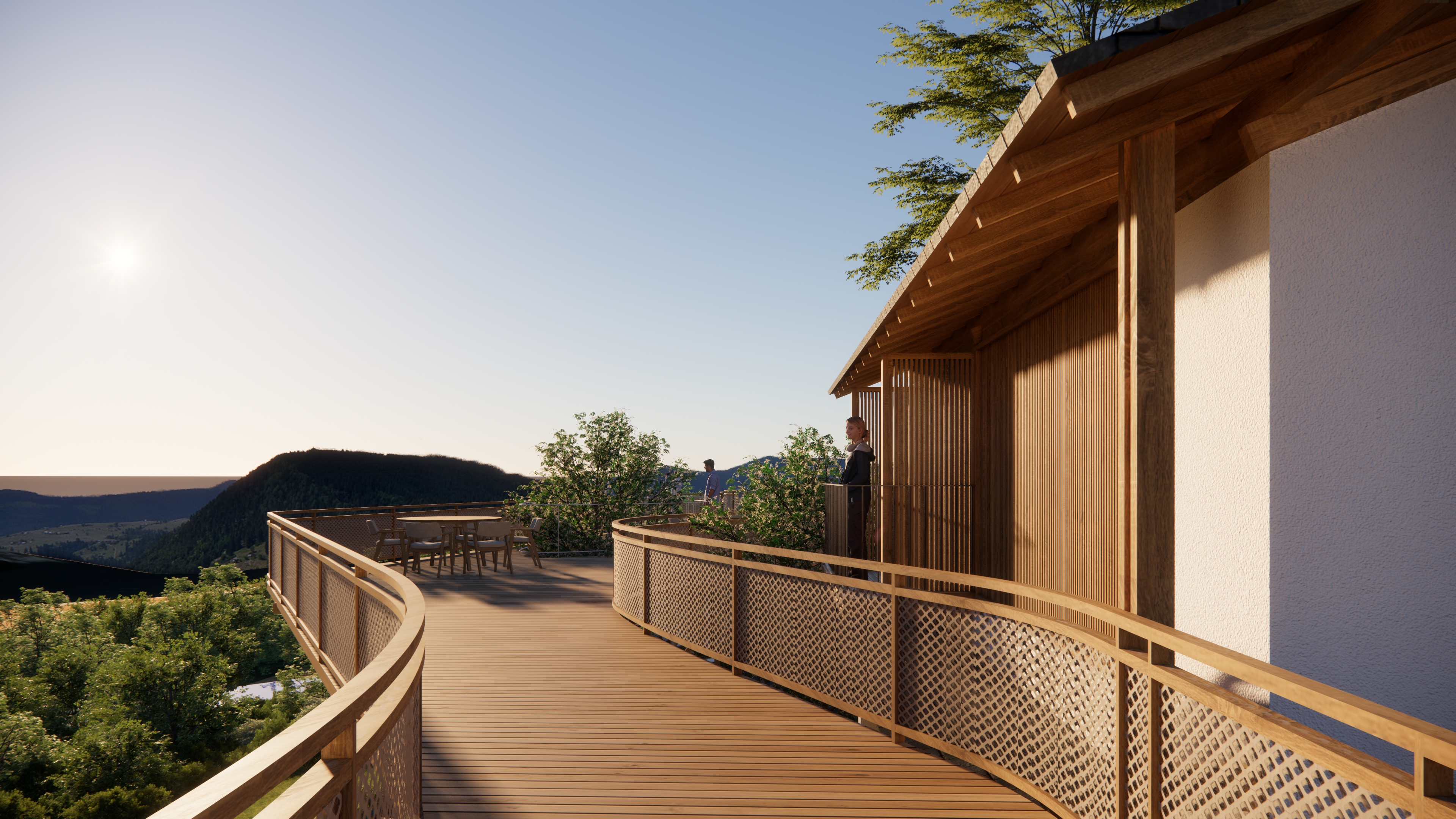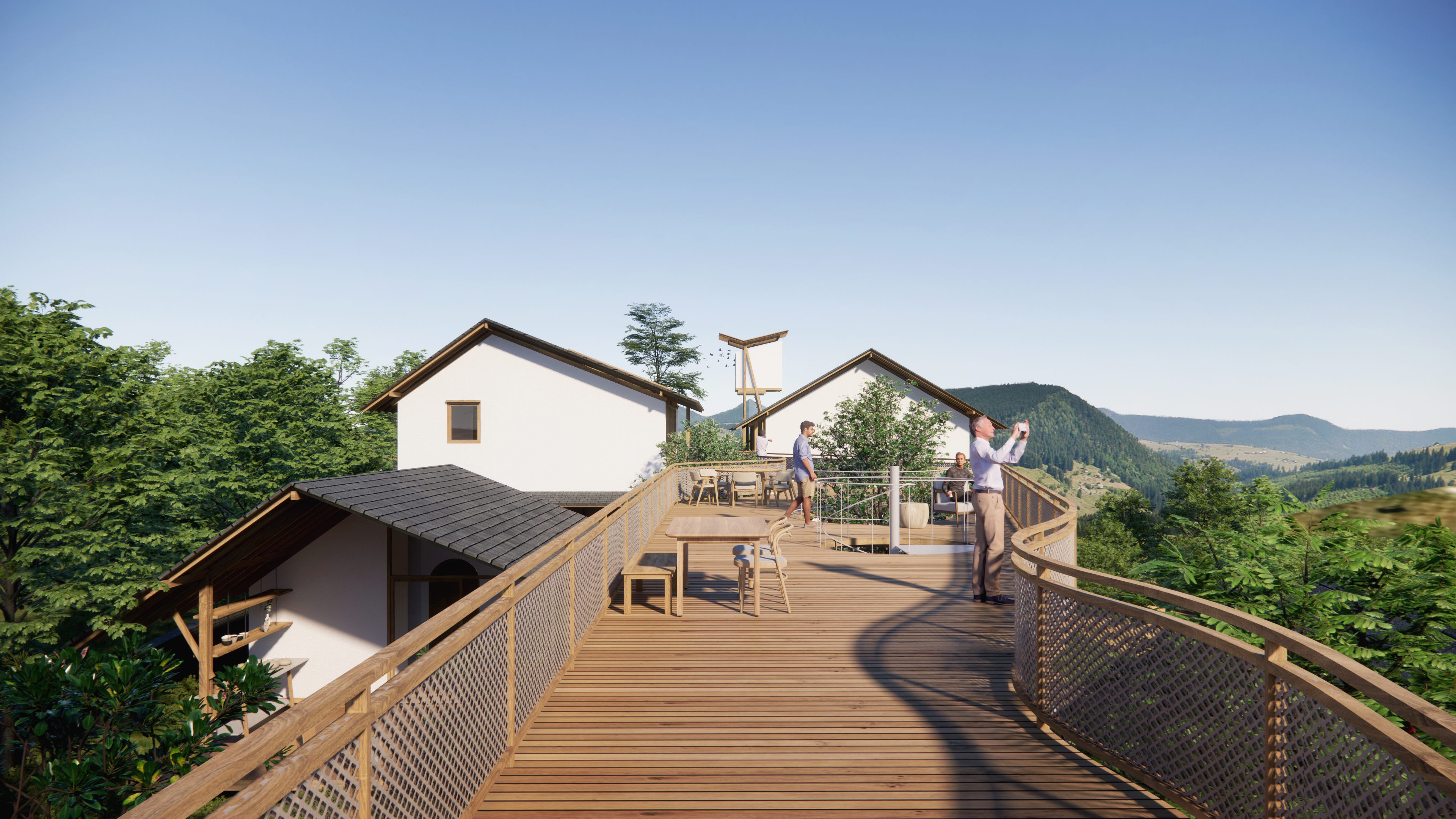 Từ đây, du khách có thể thong thả dạo bước, vừa tận hưởng sự chuyển động của không gian, vừa dừng lại ở những khoảng mở rộng như một “đài quan sát” để phóng tầm mắt ra hồ Đại Ninh và núi rừng hùng vĩ. Với sự kết hợp ấy, sàn ngắm cảnh không chỉ phục vụ mục đích lưu thông, mà còn nâng trải nghiệm nghỉ dưỡng lên thành một hành trình khám phá cảnh quan.