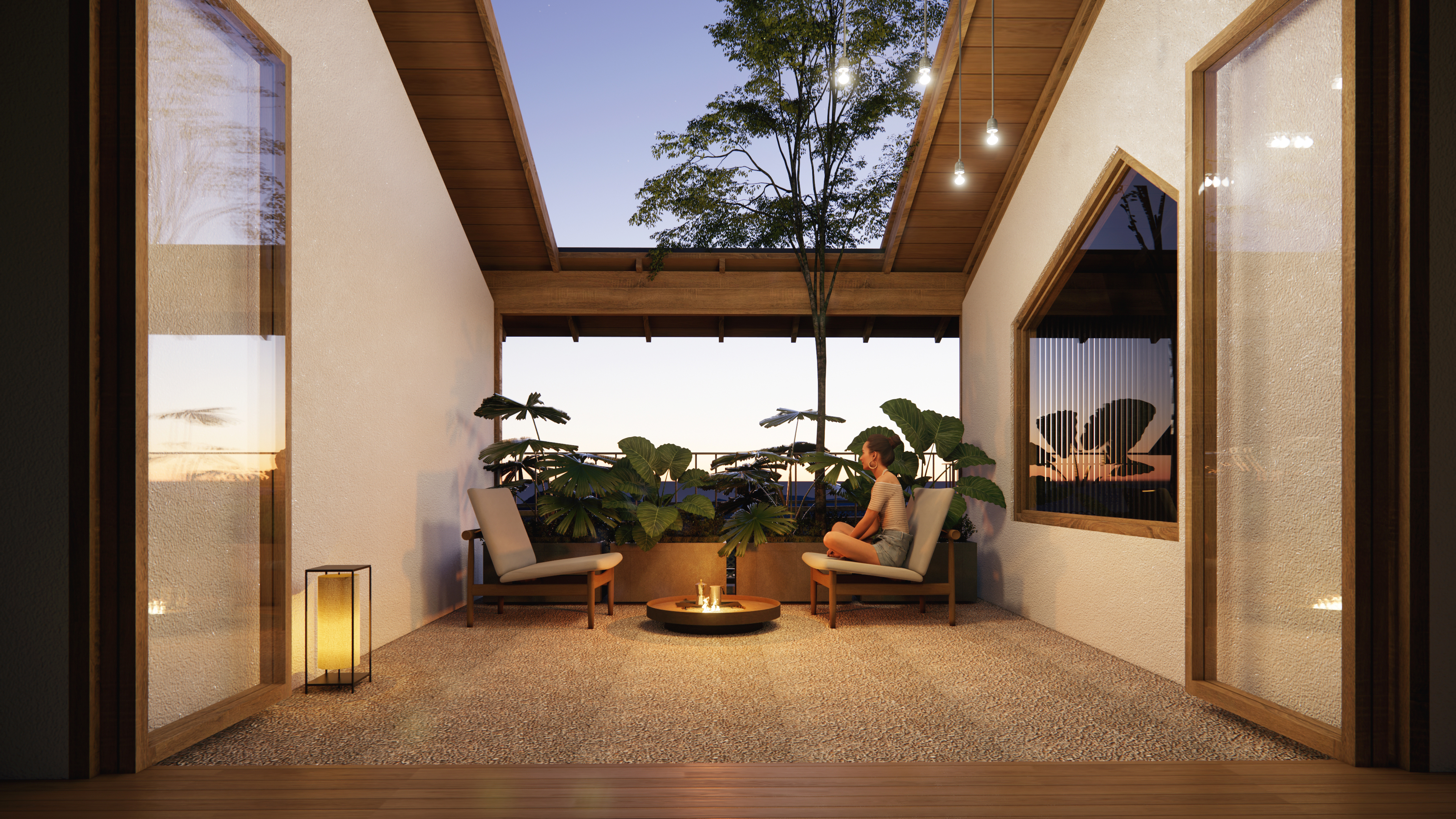 Villa Ta Hine 2 được phát triển với lối kiến trúc xen kẽ cảnh quan thành một tổng thể liền mạch. Các khối công trình uốn lượn tạo nên những lối đi rợp bóng mát, vừa dẫn dắt dòng chảy không gian vừa mang đến cảm giác thư giãn. Nổi bật ở trung tâm nội khu là sảnh hoàng hôn trên cao, điểm hẹn gợi mở tầm nhìn khoáng đạt và trở thành dấu ấn biểu tượng của toàn bộ dự án.