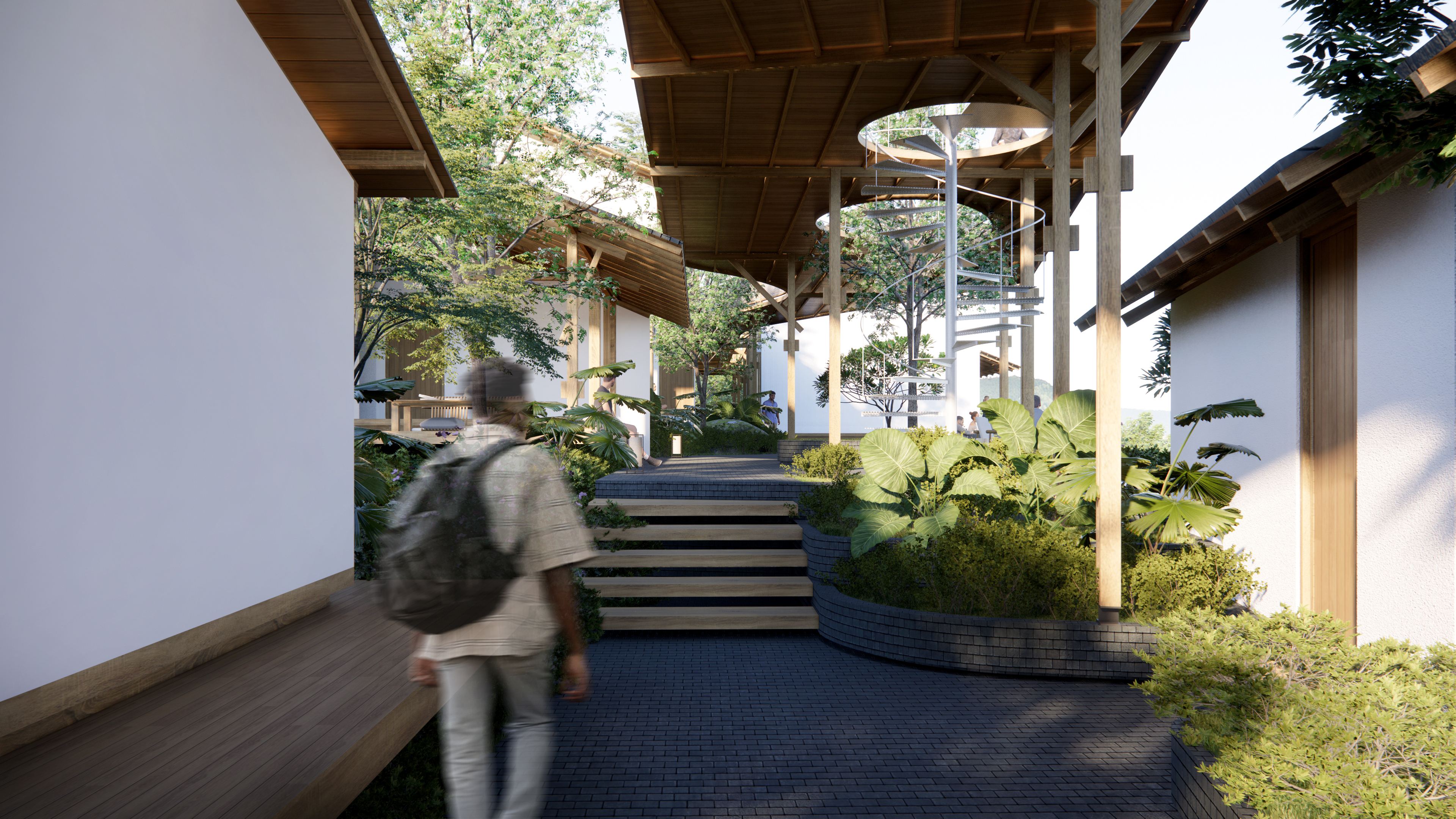 Sàn ngắm cảnh được xem là một trong những điểm nhấn thú vị của toàn khu. Không chỉ đóng vai trò như một lối đi bộ trên cao uốn lượn để kết nối các khu chức năng, sàn còn được thiết kế khéo léo để trở thành mái che tạo bóng mát cho khu vực sân vườn bên dưới.